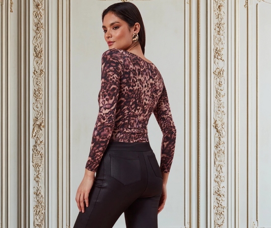 City Goddess Leopard Print Wrap Bodysuit – Long Sleeve V-Neck with Waist Belt