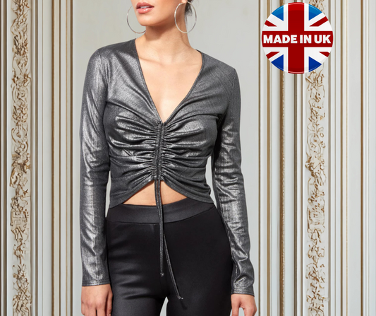 City Goddess Metallic Ribbed V-Neck Cropped Top with Drawstring – Long Sleeve Partywear